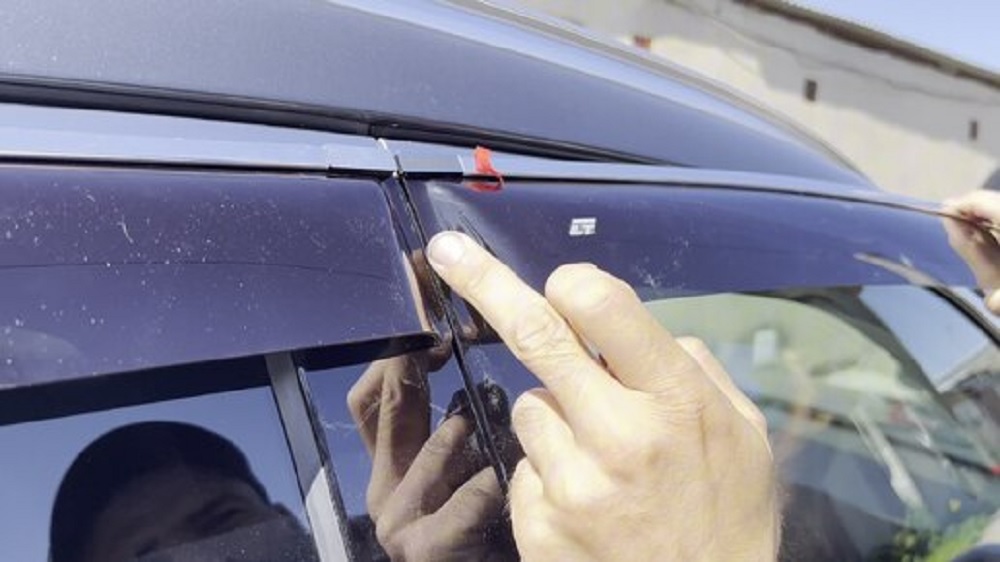 - Накладные дефлекторы: крепятся на рамку двери на клеевую ленту. Чаще всего не влияют на ход стекла, при условии правильной установки. Критичны к подготовке поверхности и температуре монтажа.